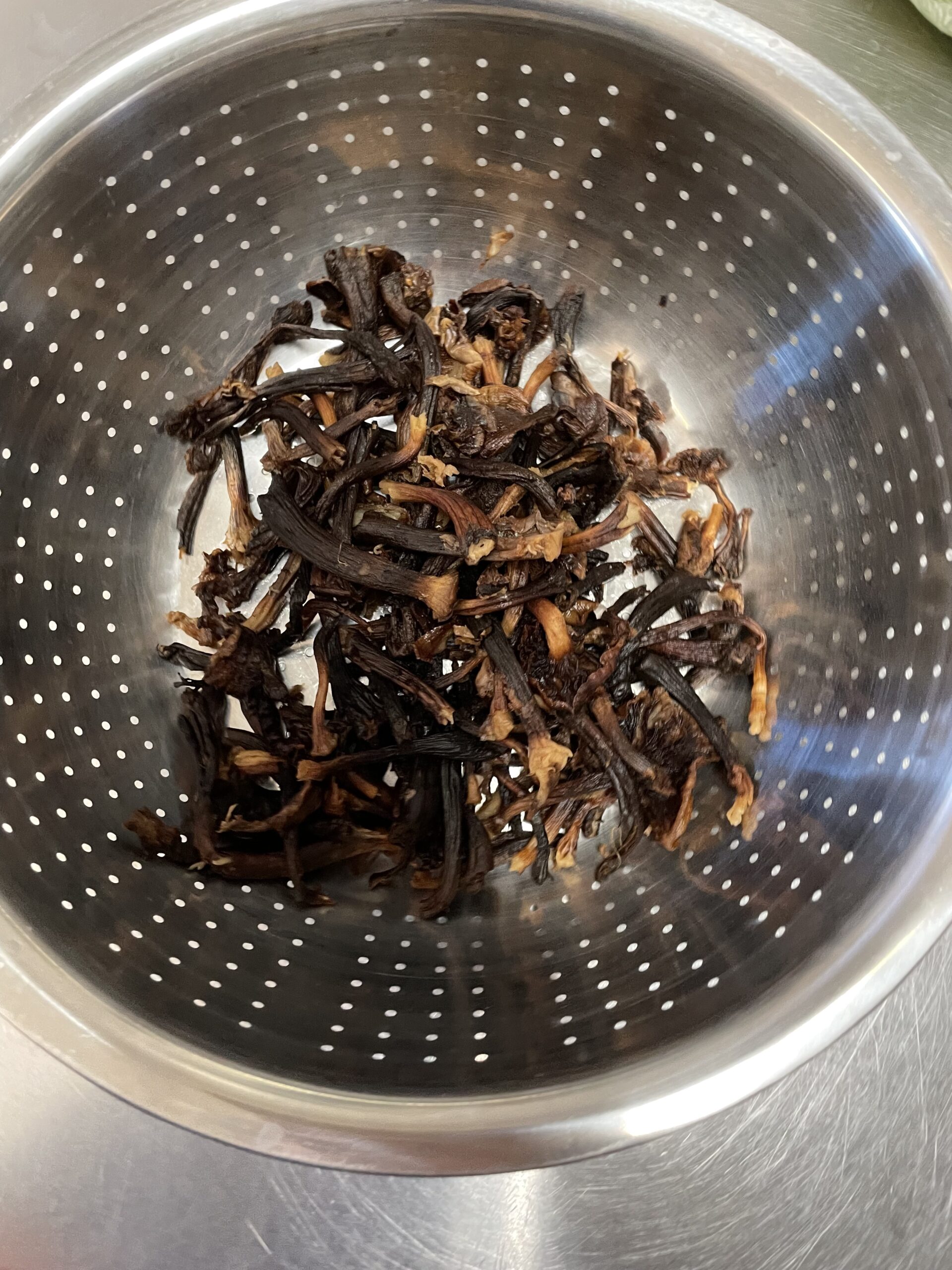 我不确定它到底叫什么,但这种菌类很眼熟,我们会拿来泡汤喝等等。所有在漏盆里的(请看上图)都是有慢性毒的,不可以吃。就是买回来新鲜的也有(它颜色深的部分),不是因为放久了,因为是在工人处理它们的时候就产生了毒素(好像是晒的时候就出现问题了)。这是当时我在大寮里做事的时候证达教尊告诉我们的。我隔着三四米远听到的,并且后来别人又给我叙述了一下。最起码的可以说这一批菌子的深色(非咖啡色)部分的有慢性毒。